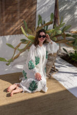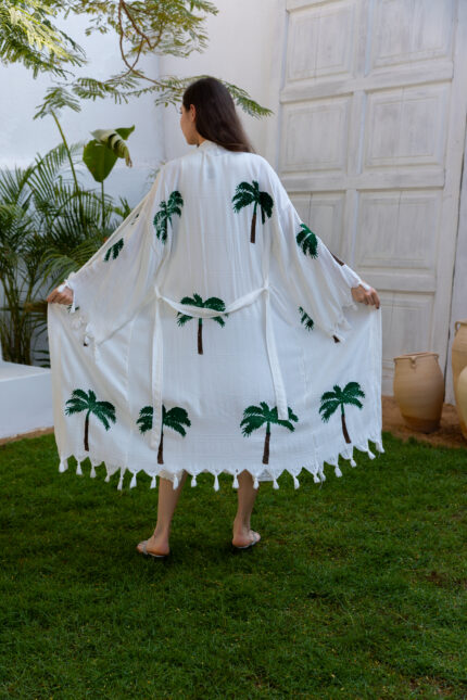 This nature-inspired kimono features soft green leaves scattered across a white background. The fresh botanical design paired with tassels on the sleeves and hem gives the piece a relaxed, elegant feel that’s perfect for warm weather layering.