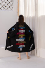 This bold black Kaftan features a fun and unexpected road sign pattern that inspires you to find your own destination.