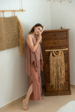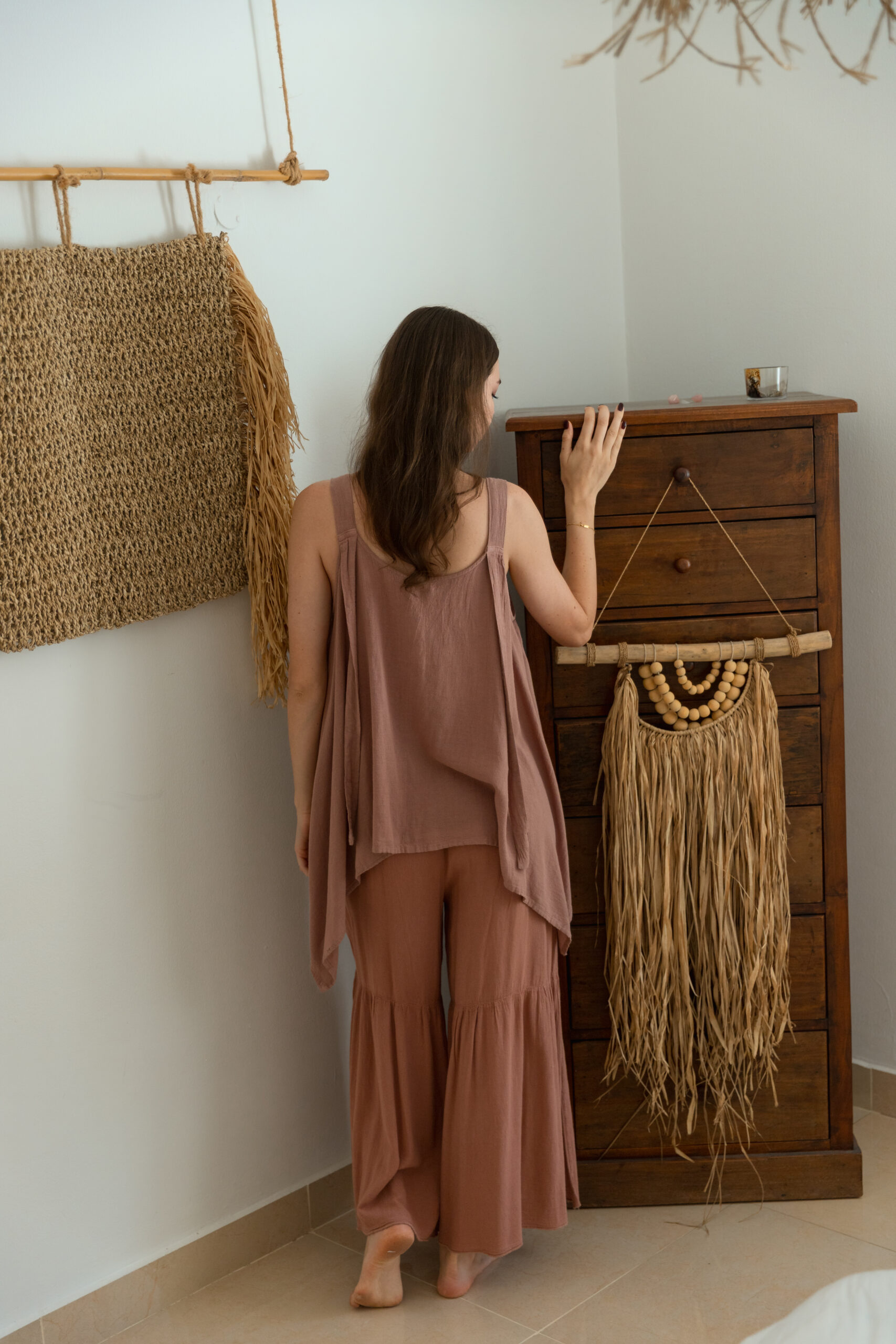 Soft, feminine, and effortlessly stylish, this blush pink boho set features a flowing top and matching wide-leg pants. The pants include a delicate side slit that enhances movement while adding a subtle touch of elegance. The lightweight fabric and relaxed fit make it perfect for warm climates, giving the piece a dreamy, romantic feel.