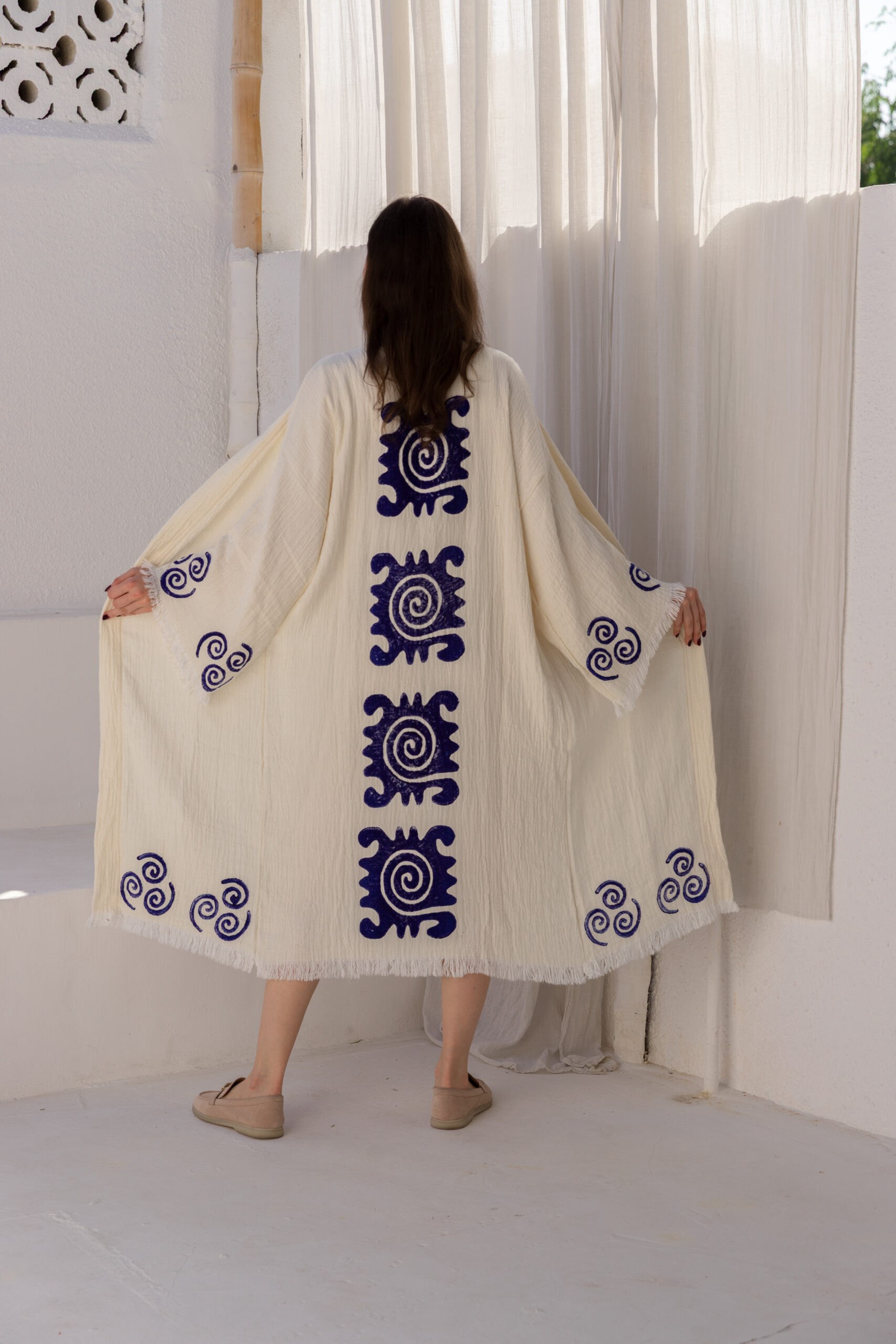 Inspired by traditional patterns, this white Kaftan features striking blue tribal-style symbols throughout the fabric. The relaxed fit and breathable material make it a perfect balance between cultural inspiration and modern resort style.