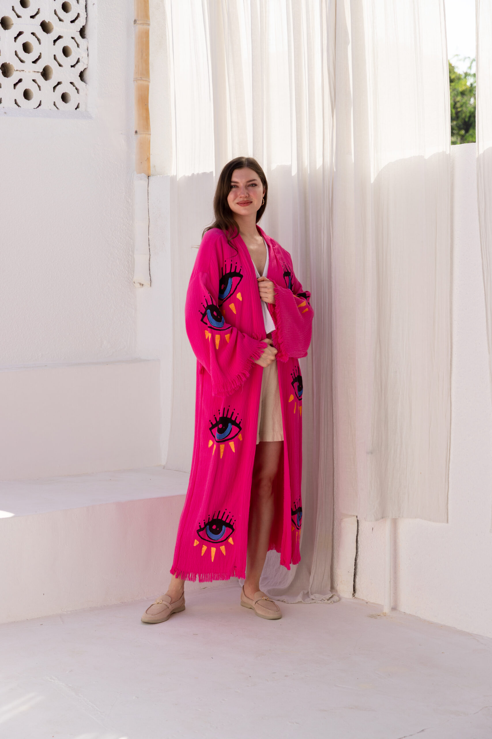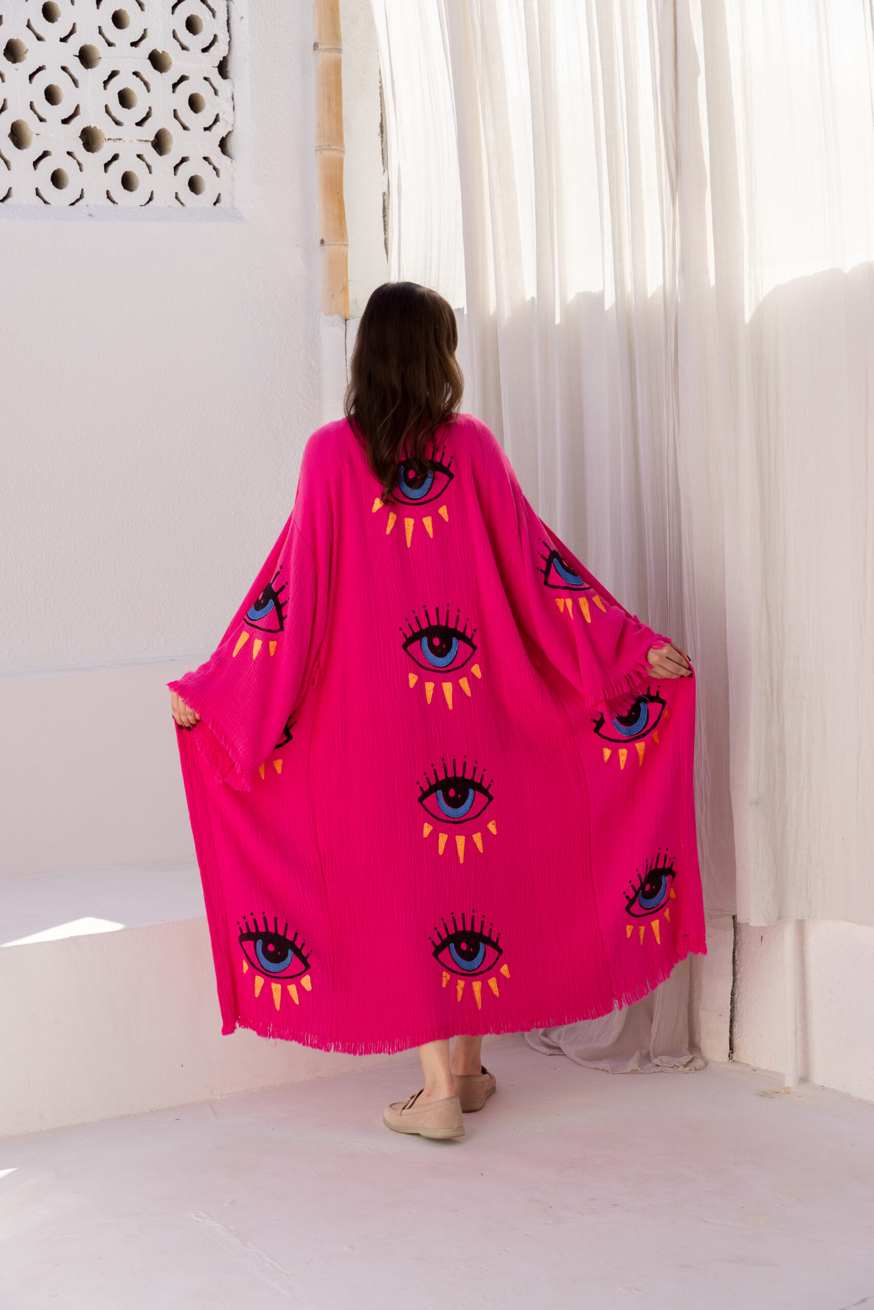 Stare is rich in color and personality, this dark pink Kaftan showcases a bold eye motif that stands out beautifully. The comfortable, flowing silhouette makes it a perfect blend of statement style and relaxed wear.