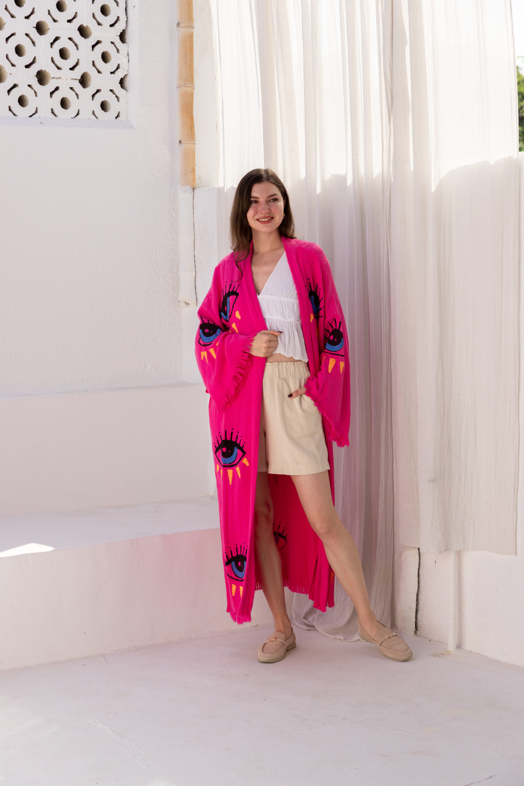 Stare is rich in color and personality, this dark pink Kaftan showcases a bold eye motif that stands out beautifully. The comfortable, flowing silhouette makes it a perfect blend of statement style and relaxed wear.