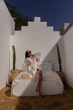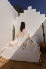 Bright and radiant, this beautiful kimono features a large yellow sun on the back with smaller sun motifs throughout the design. The flowing shape and tassel accents create a playful yet elegant piece that captures the warmth and energy of sunny days.