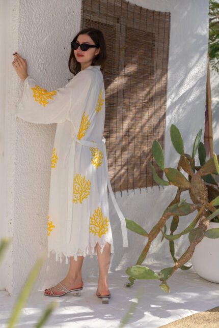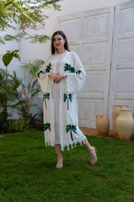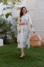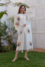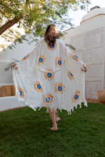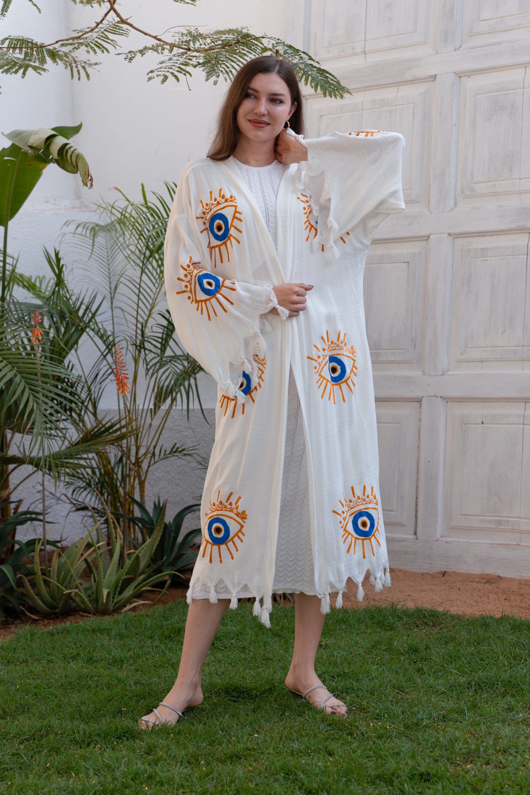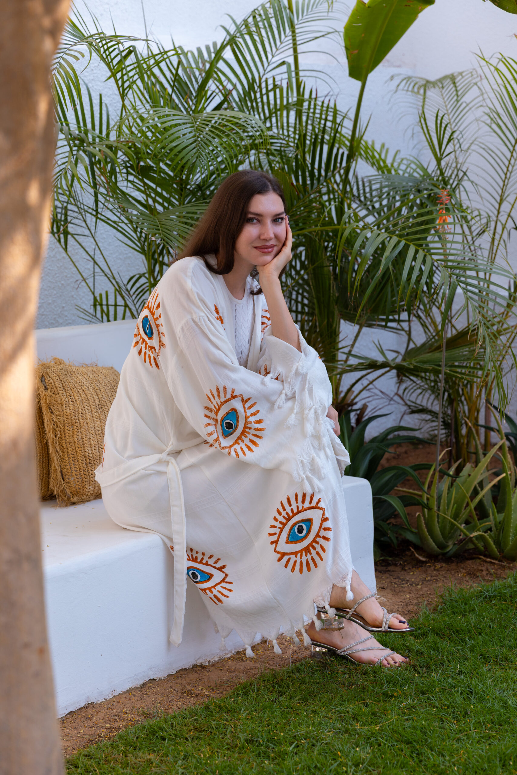 This striking white kimono features a bold blue eye design accented with vibrant orange lashes. The artistic motif gives the piece a modern, expressive feel, while the soft fabric and tassel details on the sleeves and hem create a relaxed, flowing silhouette.