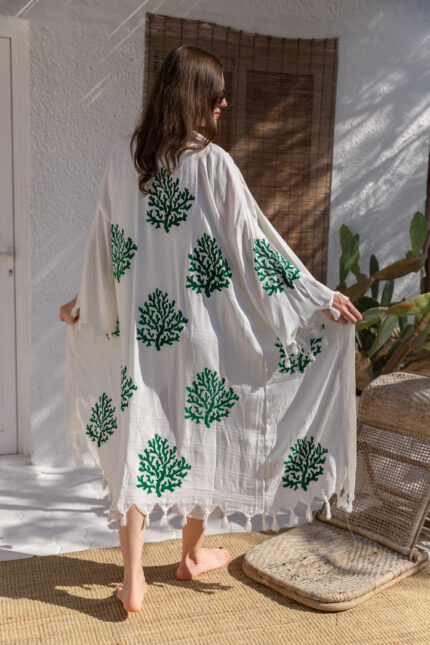Fresh, soft, and effortlessly elegant, this boho-inspired set pairs a breezy sage green top with flowing ivory pants. The top features open sides that create a relaxed, airy silhouette, adding movement and a touch of effortless charm. Crafted for comfort and style, the lightweight design makes it perfect for warm days, coastal escapes, or relaxed resort wear. The combination of soft green and classic white captures the calm beauty of natural, bohemian living.